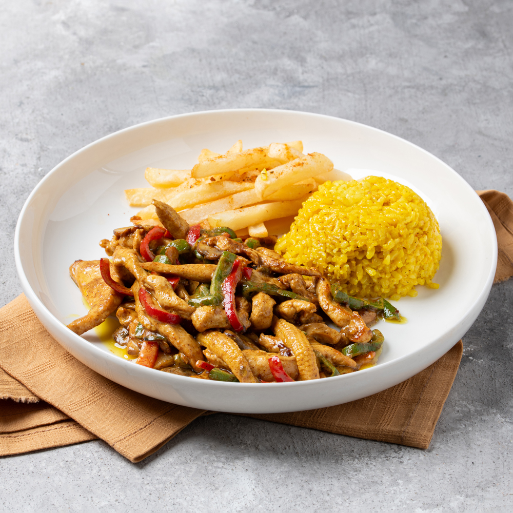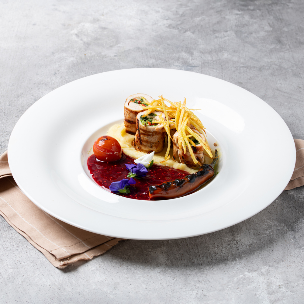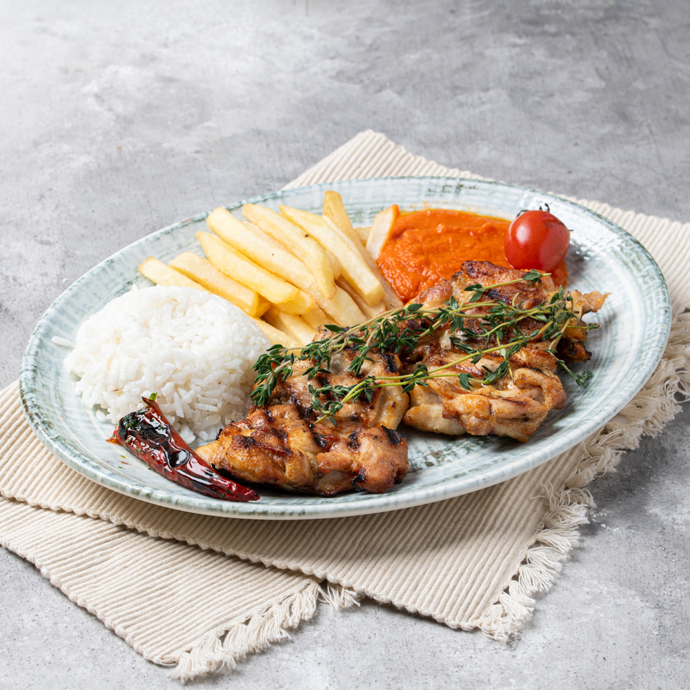 Izgara tavuk krema, kültür mantarı, patates püresi, zerdeçallı basmati pilavı ile