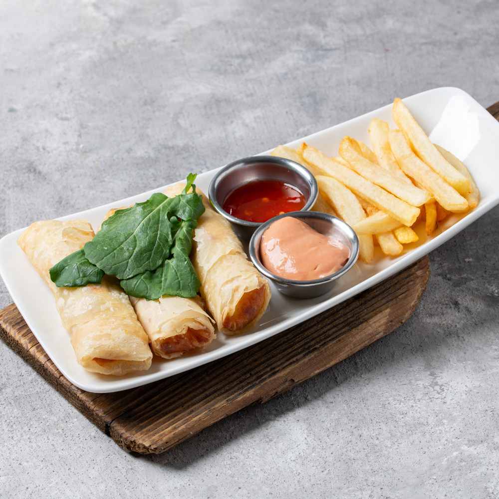 Paçanga böreği, sigara böreği, el yapımı soğan halkası, mozeralla çubukları, çıtır tavuk, mini köfte, dana sosis, patates kızartması, çedar topları, sweet chili, kokteyl sos.